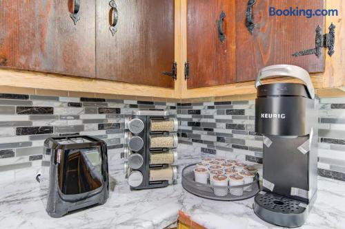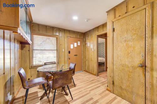 As you step inside, you will be welcomed by our cabin themed kitchen and living room which is the perfect place to gather with friends and family, featuring a cozy atmosphere and a 65" smart TV for your entertainment. The Vivint security system ensures your safety during your stay. The sun room is the perfect place to relax and unwind, with lots of natural light and comfortable seating. Our four spacious bedrooms feature a total of six comfortable beds, ensuring a restful night's sleep for everyone. There are also two bathrooms, providing ample space for larger groups. If you're traveling with pets, our property is equipped with a pet fence to keep them safe and secure during your stay. For those who need to work remotely, we have a dedicated workstation with all the essentials you need to stay productive. Our corner lot property boasts a large backyard, perfect for outdoor activities and gatherings. The 2 car garage provides secure off-street parking for your vehicles. With easy interstate access, our property is conveniently located for easy travel to and from the town's attractions.